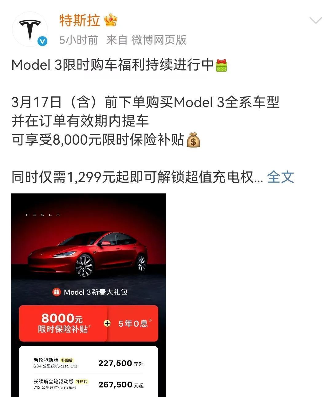 3月5日,特斯拉在官方微博宣布,3月17日前下单购买Model 3全系车型,并在订单有效期内提车的中国消费者,可享受8000元限时保险补贴。